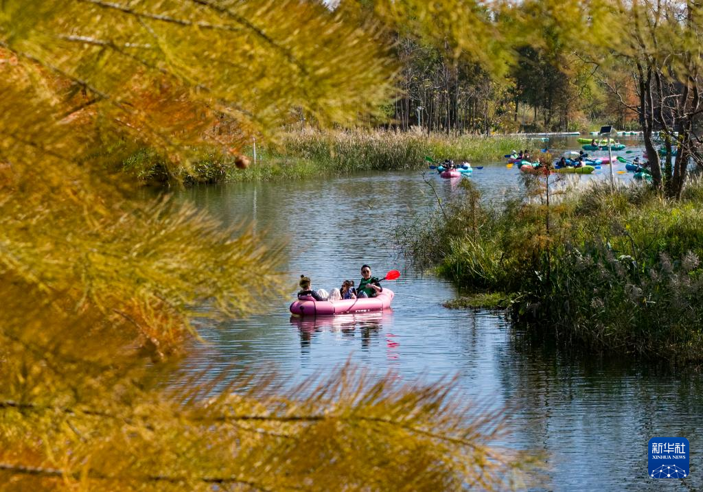 11月30日,游客在浙江省宁波植物园水杉林中挥桨戏水(无人机照片)。