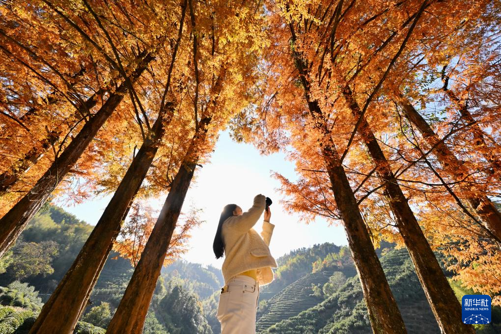 12月1日,游人在福建武夷山洋庄乡吴三地村附近拍摄杉林景观。