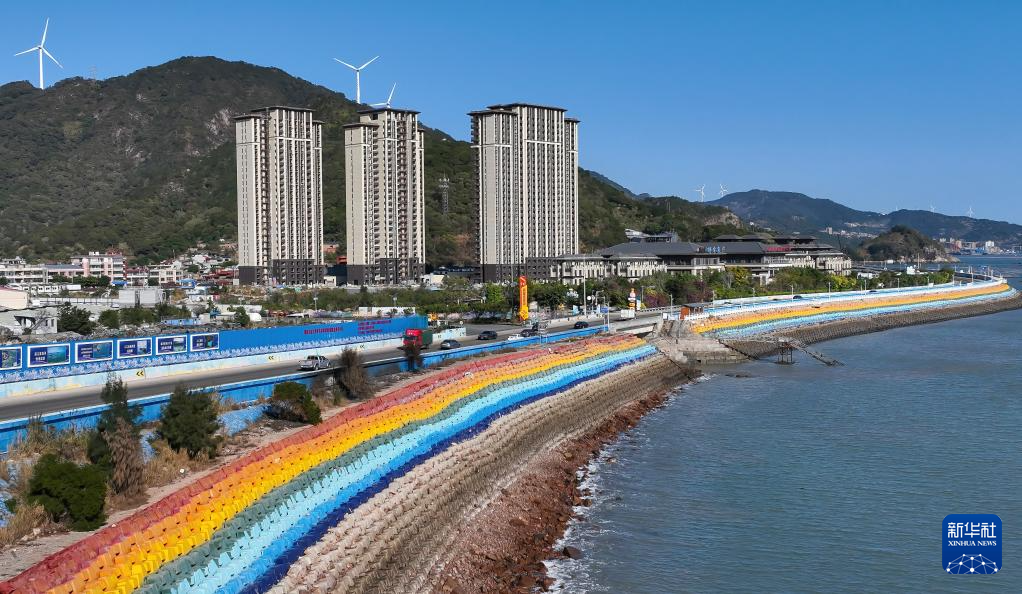 这是位于福建省连江县官坞村渔夫岛的彩虹堤坝(12月6日摄,无人机照片)。