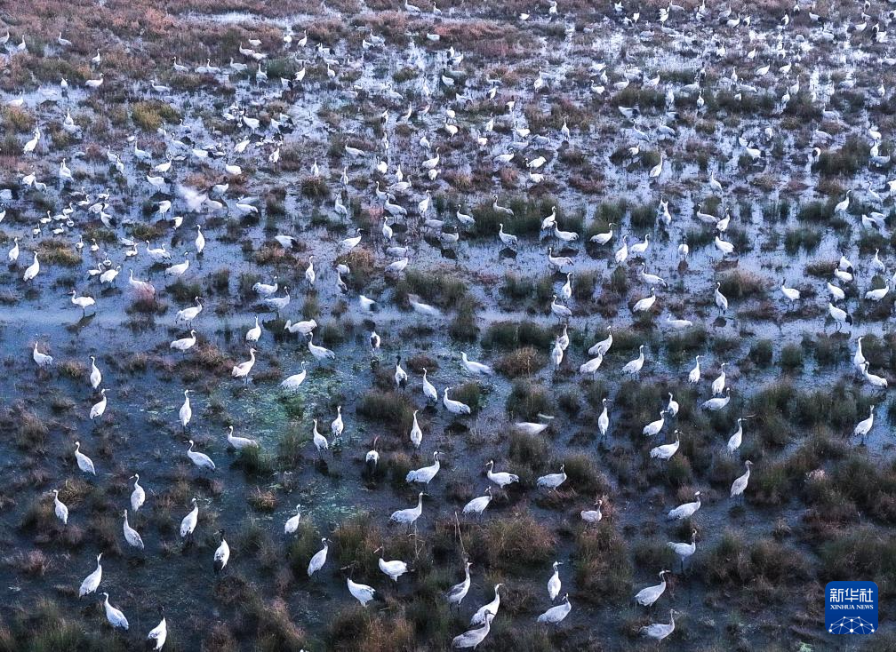 日前,贵州草海国家级自然保护区迎来国家一级保护动物黑颈鹤越冬高峰,加上灰鹤、斑头雁等其他鸟类,呈现万鸟翔集的生态景象。