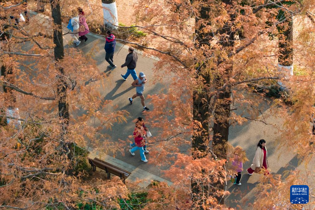 连日来,湖南省长沙市烈士公园的水杉树叶转红,在冬日暖阳的映照下,园内景色如画,吸引不少市民前来游玩打卡。