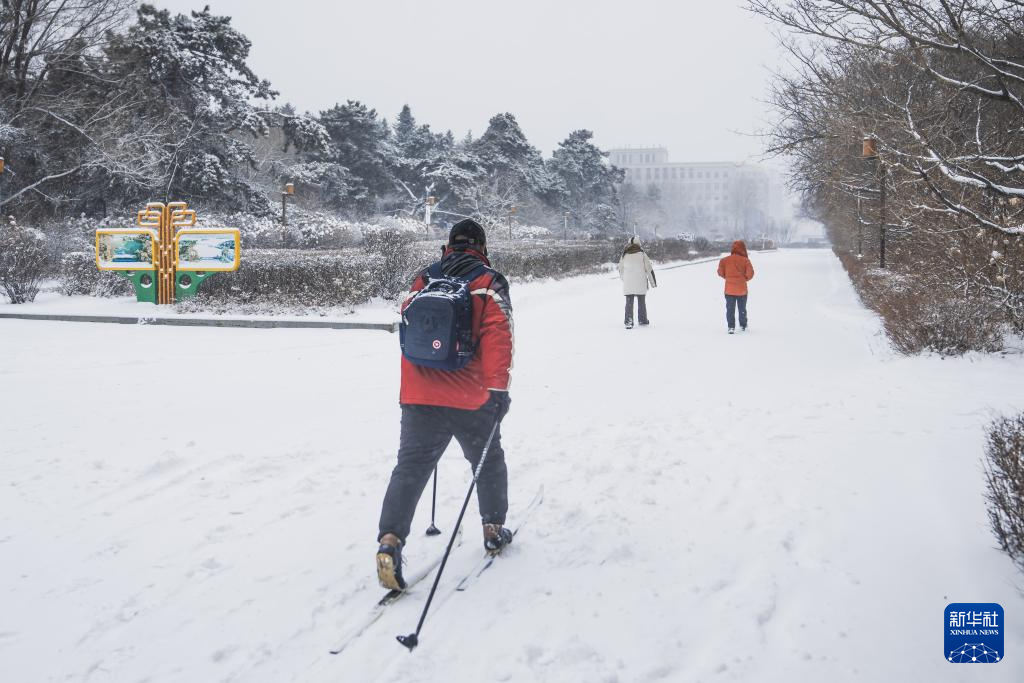 12月23日,一名长春市民踩着滑雪板冒雪出行。