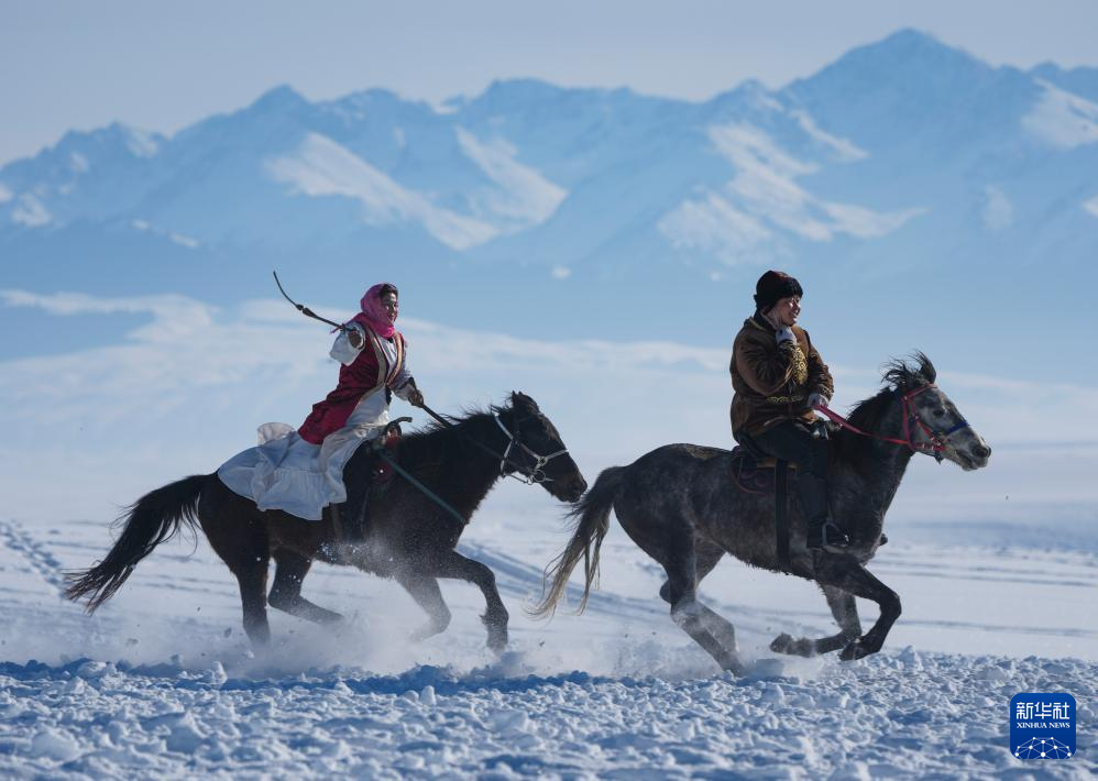 1月3日,牧民在新疆昭苏湿地公园为游客表演。