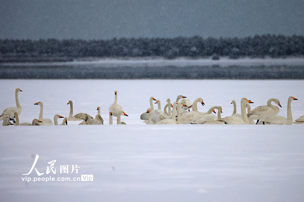 2026年1月11日,山东荣成大天鹅国家级自然保护区天鹅湖,一群大天鹅正在雪中嬉戏。王福东摄(人民图片网)