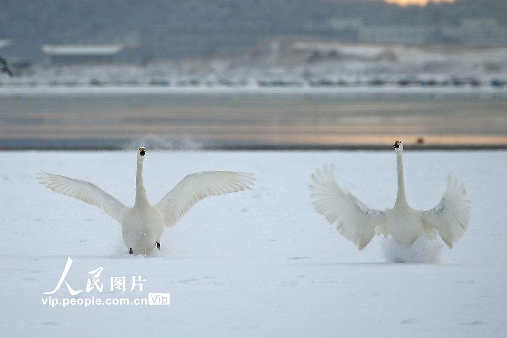 山东荣成:天鹅浴雪