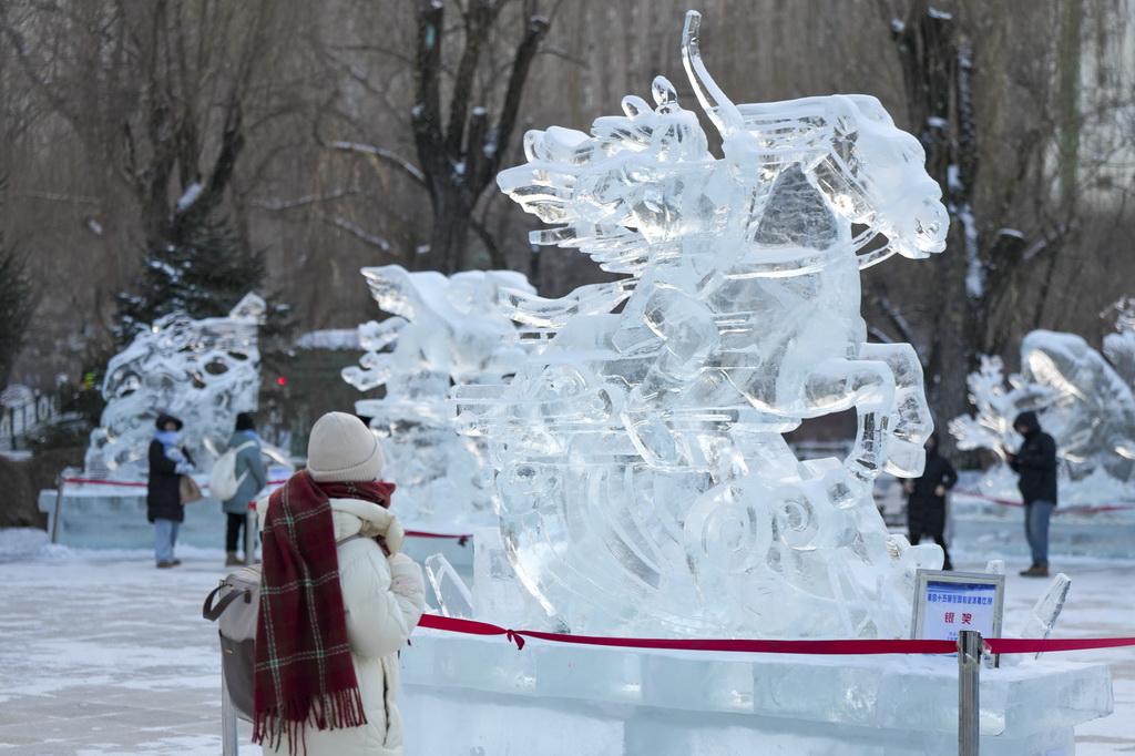 游客在哈尔滨市兆麟公园举办的第52届哈尔滨冰灯艺术游园会上欣赏冰雕作品(1月14日摄)。