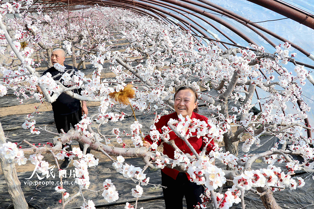 2026年1月20日,正值大寒节气,甘肃平凉静宁县城川镇靳寺村,果农正忙着为杏花进行人工授粉。王毅摄(人民图片网)