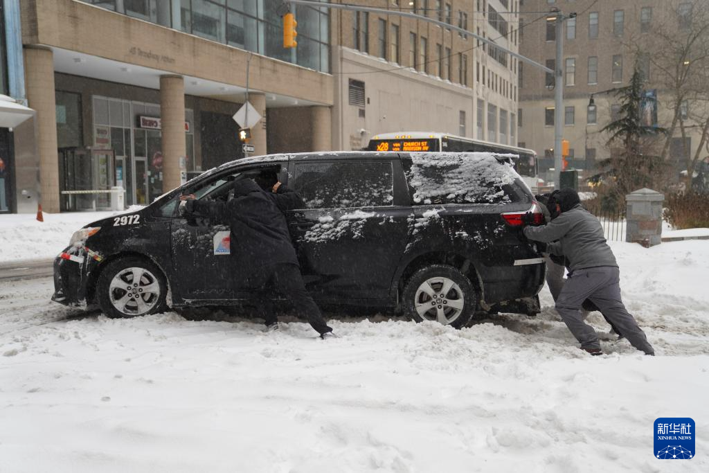 1月25日,在美国纽约,人们推动陷在雪中的汽车。