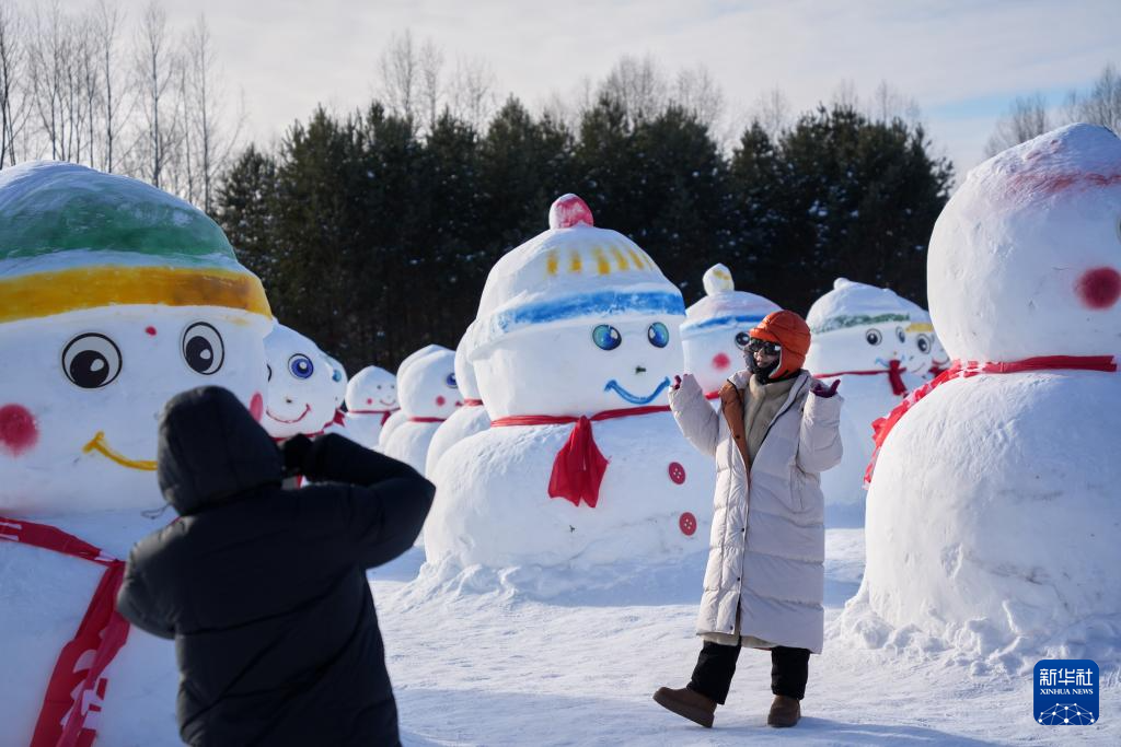1月29日,游客在漠河北极村景区内的北极沙洲与雪人“矩阵”合影。