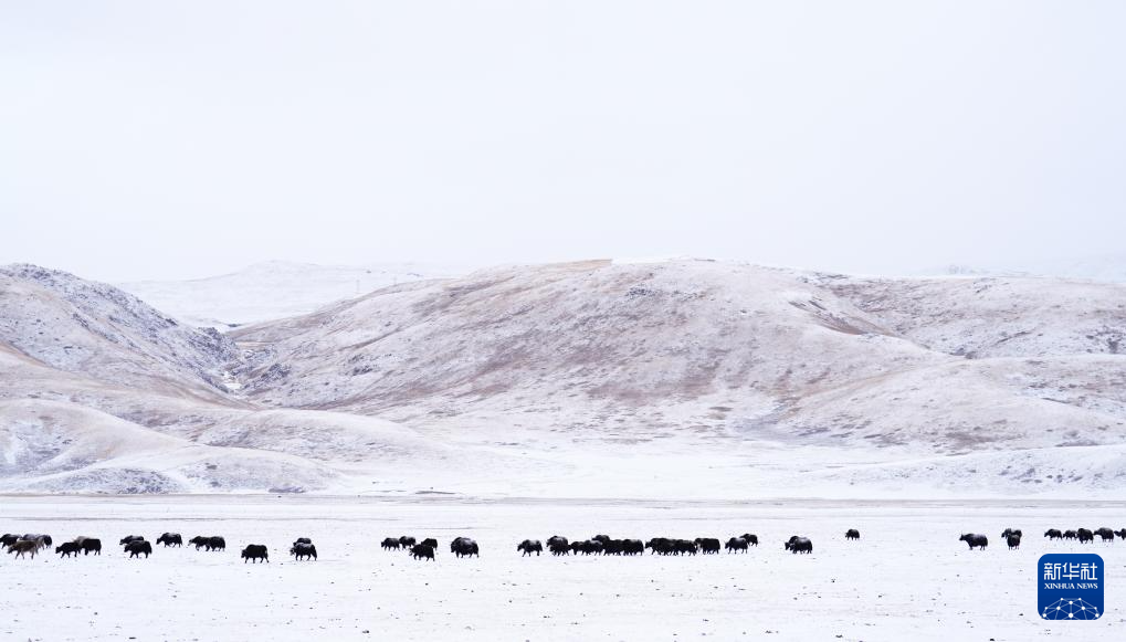 1月29日,一群牦牛在青海省玉树藏族自治州杂多县境内的草原上觅食。