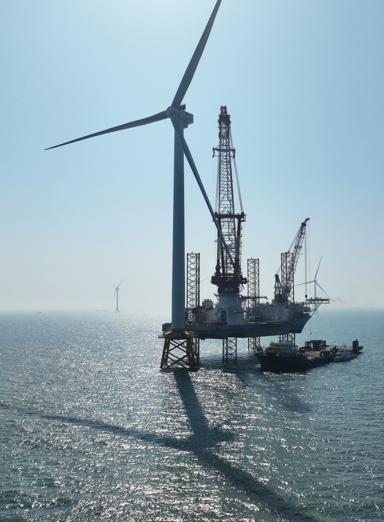 这是1月13日在闽南海域拍摄的20兆瓦海上风电机组和“大桥海风”号2000吨自升式海上风电安装平台(无人机照片)。