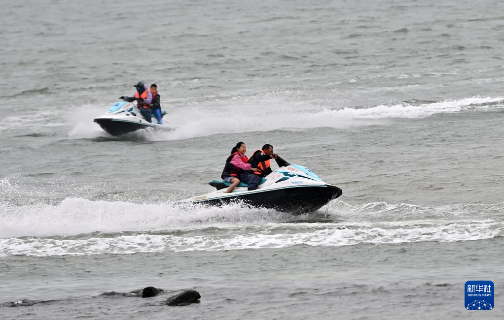 立春时节,广西北海市气温逐渐回暖,不少游客乘坐摩托艇等工具在海上冲浪游玩。