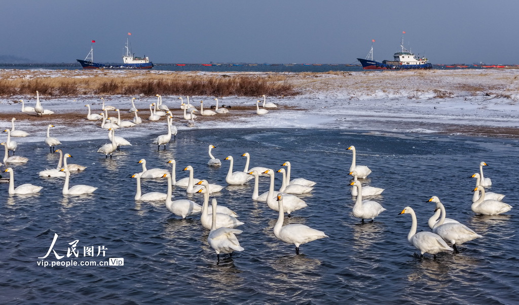 山东荣成:天鹅沐雪