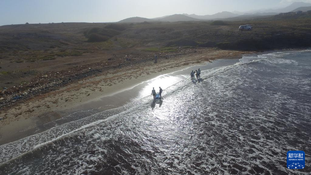 2月11日,在佛得角圣地亚哥岛圣多明戈斯市莫亚莫亚社区附近,当地妇女在海滩上收集海藻(无人机照片)。
