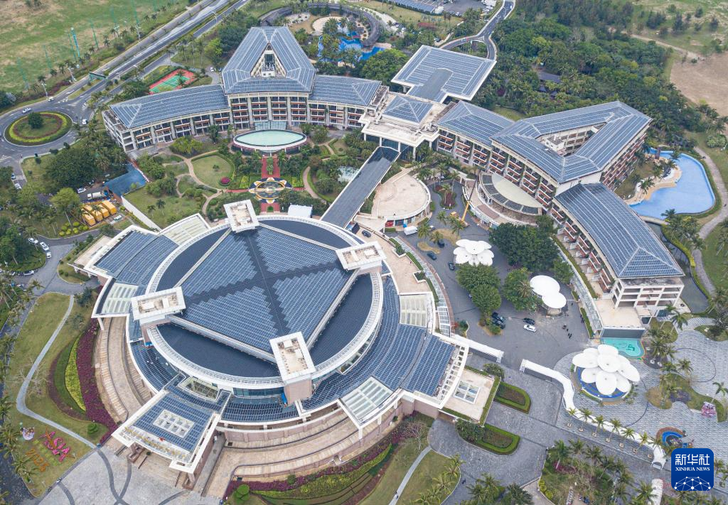在海南博鳌零碳示范区拍摄的博鳌亚洲论坛国际会议中心和博鳌亚洲论坛大酒店屋顶的光伏设备(2025年3月16日摄,无人机照片)。