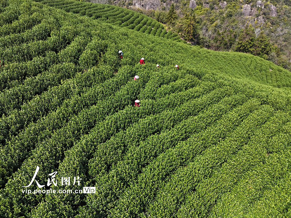 2026年3月3日,随着气温回升,浙江乐清市白石街道中雁村玉甑茶园茶树吐露新芽,茶农们正忙着采摘今年首批春茶。蔡宽元摄(人民图片网)