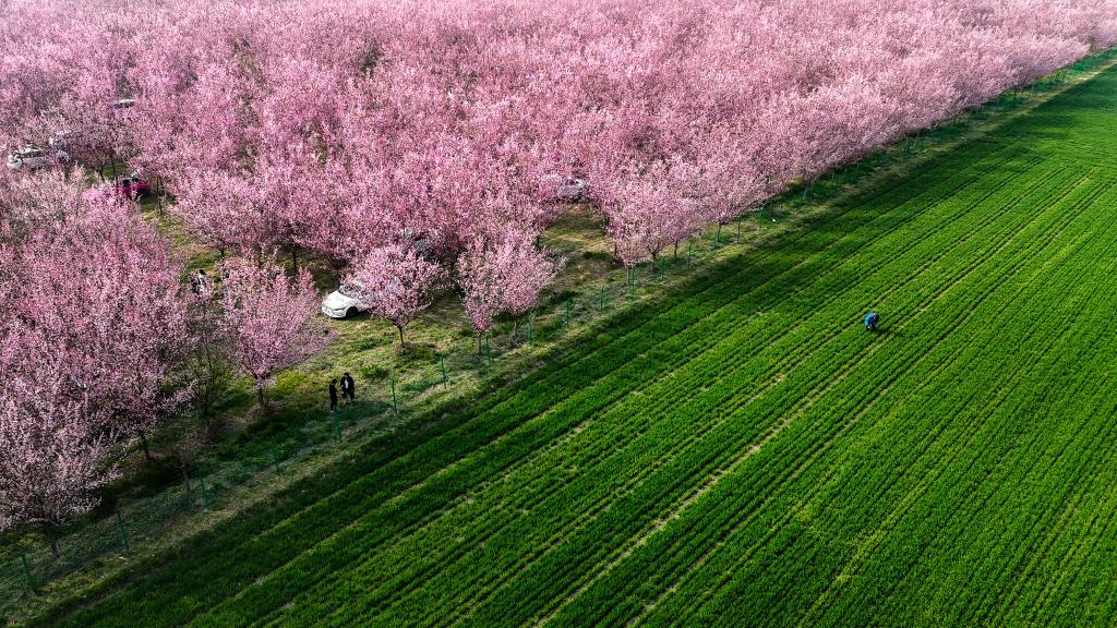 3月11日拍摄的西安市鄠邑区甘河街道丁村的梅花种植园(无人机照片)。