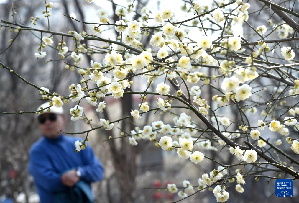 3月16日,一名游客在北京明长城遗址公园欣赏绽放的梅花。