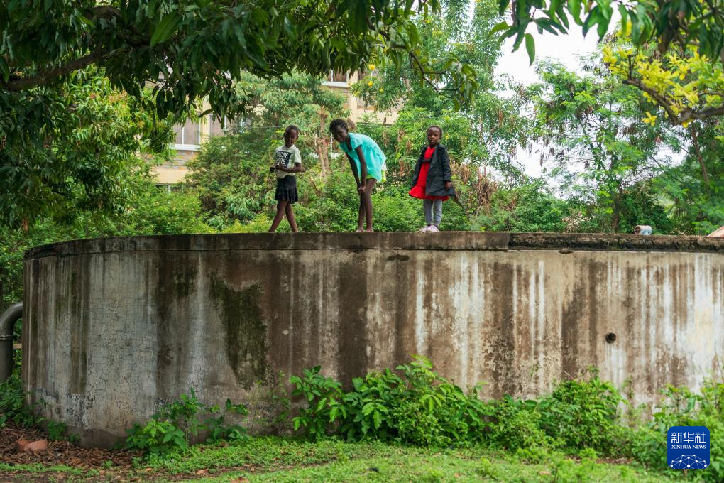 在维多利亚湖畔的肯尼亚霍马湾,小朋友在一处储水设施上玩耍(2026年3月1日摄)。
