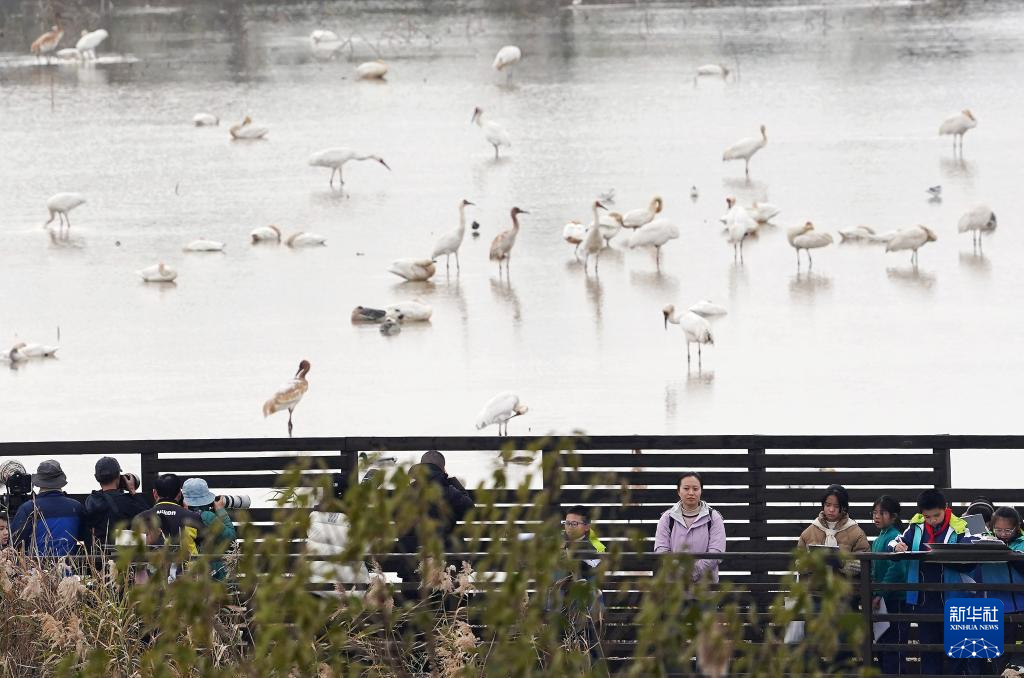 在鄱阳湖畔的江西省南昌市高新区白鹤小镇,游客们近距离观察野生白鹤(2024年12月17日摄)。
