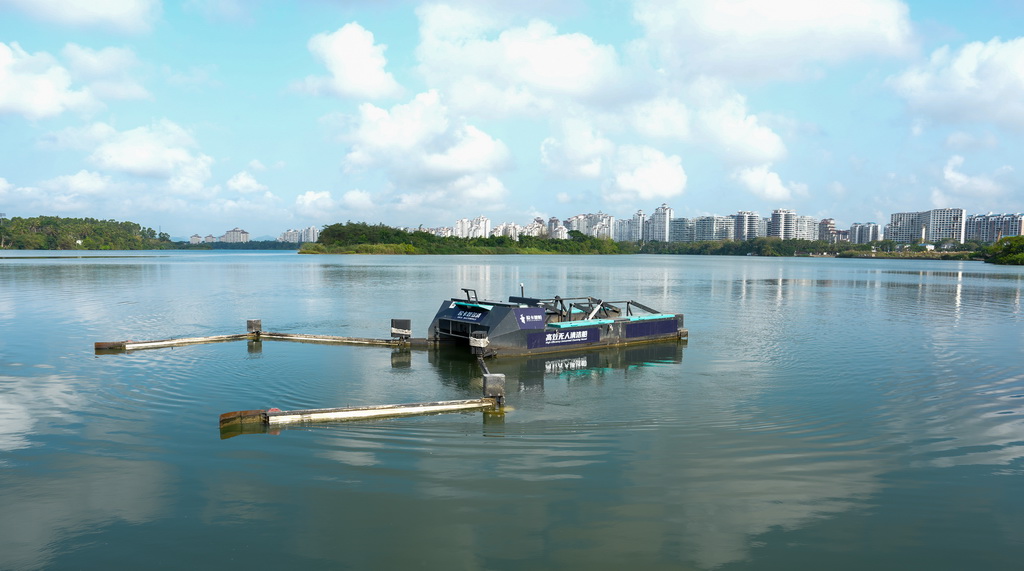 水上智慧环卫无人清洁船在万泉河水面作业(3月25日摄)。新华社记者 刘莲芬 摄