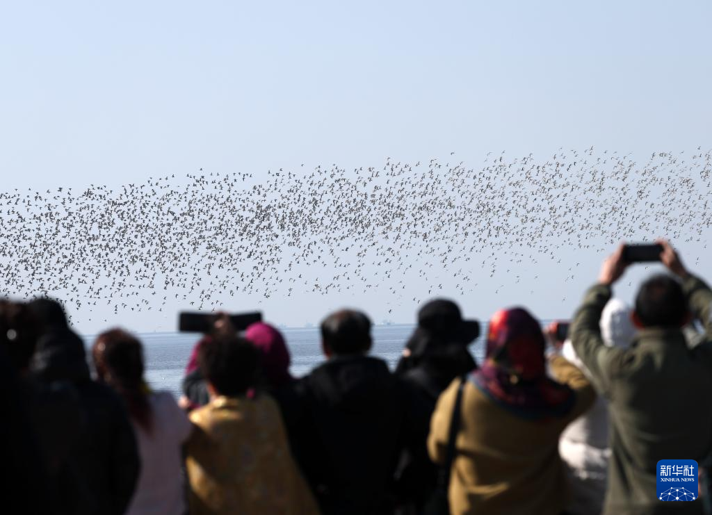 近日,辽宁丹东鸭绿江口候鸟栖息地候鸟翔集,形成“鸟浪”景观,吸引游客前来观赏。