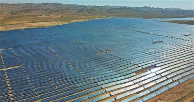 绿色的除了“节流”的风,还有“开源”的光。站在腾格里沙漠南缘,放眼眺望,百万余块光伏板首尾相连,随着沙丘起伏延伸,把沙漠“染”成靛蓝的海洋。中卫年日照时间超过3000小时,发展太阳能发电,得天独厚。