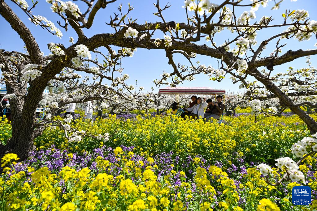 4月6日,游客在河北省晋州市周家庄乡梨园里踏青赏花。