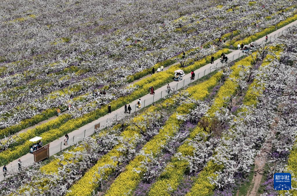4月6日,游客在河北省晋州市周家庄乡第九生产队梨园赏花(无人机照片)。