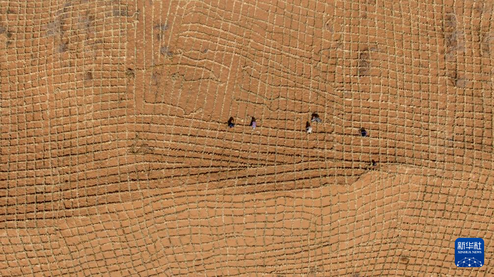 4月10日,在宁夏中卫市国有林业总场长流水管理站腾格里沙漠东南缘,治沙工人利用“刷状网绳式草方格沙障”固沙(无人机照片)。