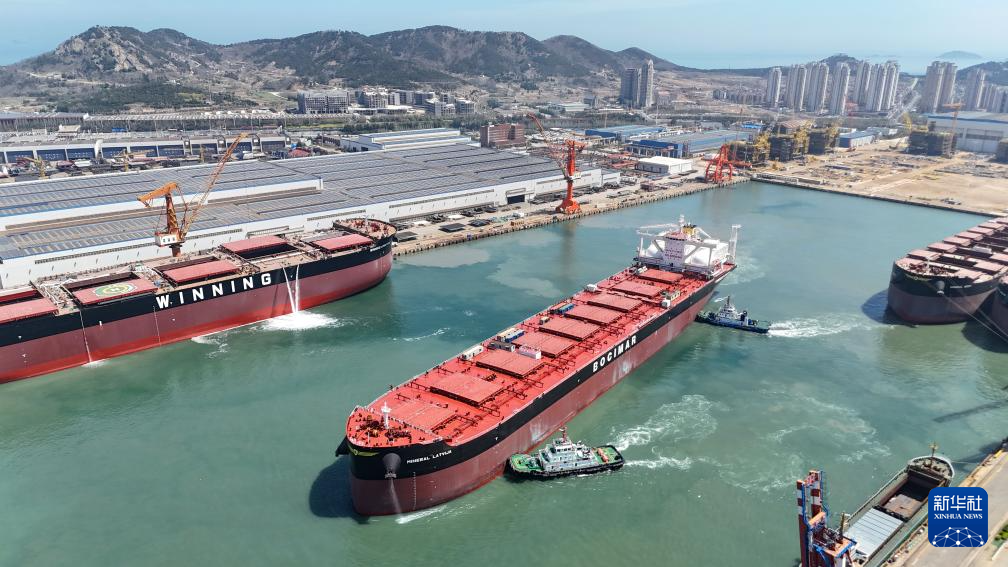 4月13日,21万吨绿色燃料船舶驶离中国船舶集团青岛北海造船有限公司码头启程海试(无人机照片)。