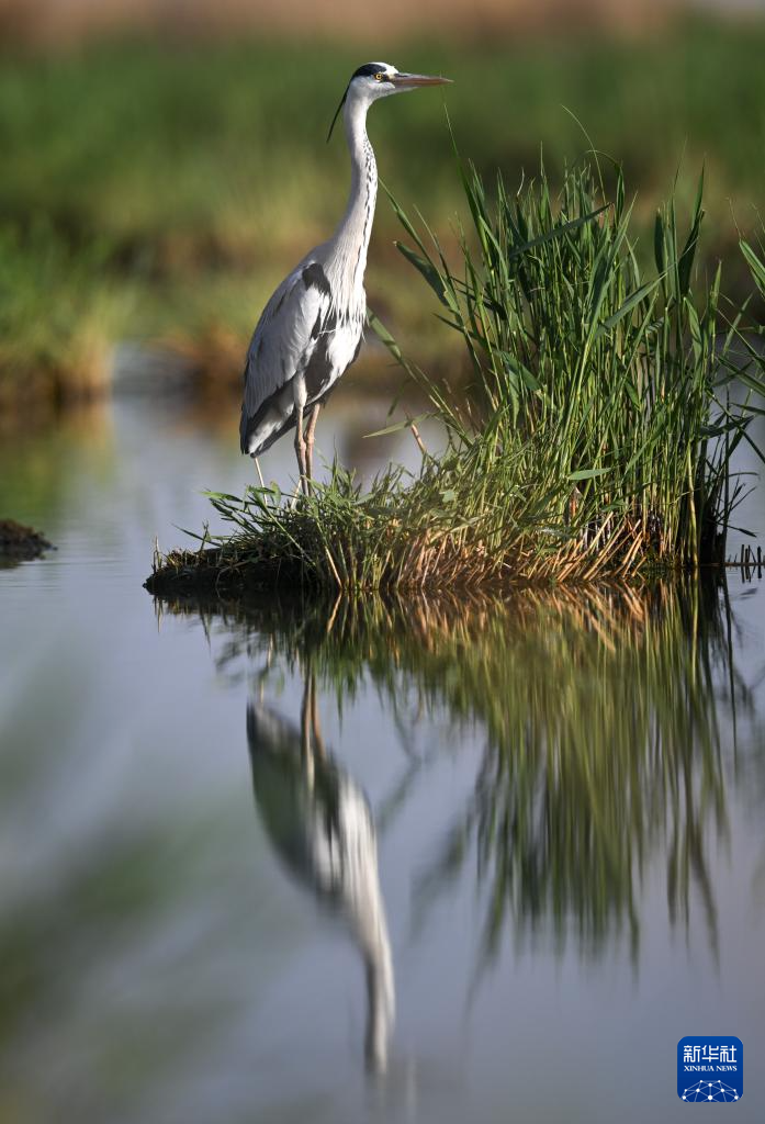 4月18日,苍鹭在沙湖中栖息。