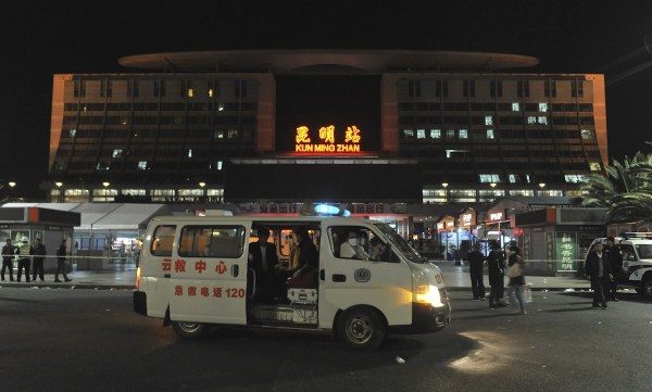 2014年3月1日晚,在昆明火车站,路上停着120救护车。