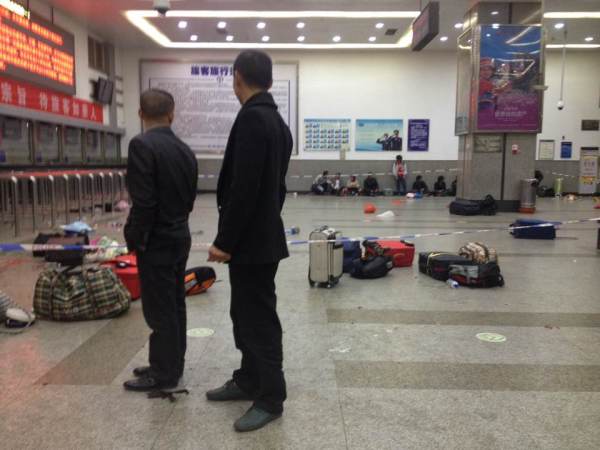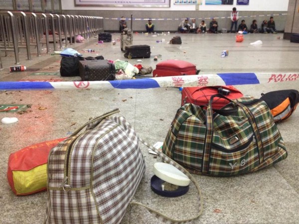 3月1日晚,昆明火车站,两个准备买票的乘客被告知今晚没有车票出售,他们的身边是一地散落的行李和伤者的血迹。