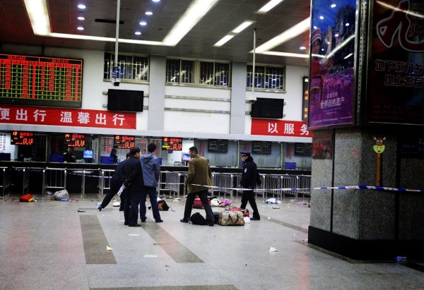 3月2日凌晨,昆明火车站售票厅内拉起了警戒线,许多现场散落的行李集中在了线内。