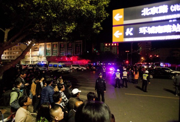 3月2日凌晨,昆明火车站站前多条路戒严,大批警察驻点维持秩序。