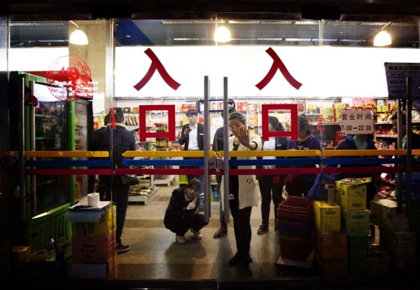 3月2日凌晨,昆明火车站售票厅旁边的超市,在超市内的旅客用锁把自己锁在里面,惊恐的向外张望。