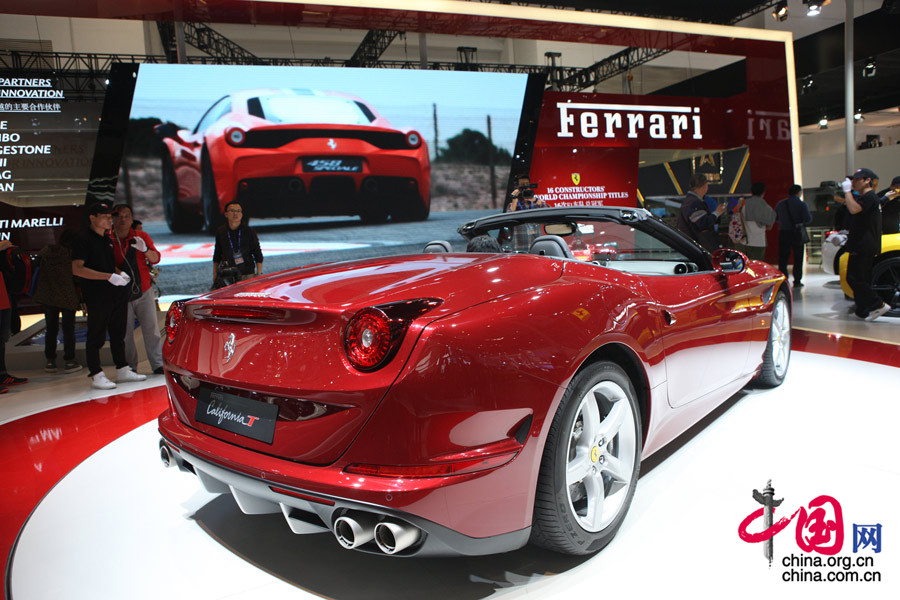2014年4月20日,法拉利携旗下全新california T 敞篷跑车亮相2014年北京国际车展。california T搭载前置8缸发动机,零至百公里加速仅需3.6秒。california T配备了全新V8涡轮增压发动机,该发动机将顶级性能、超强扭矩、法拉利传统的发动机声效与涡轮增压的燃油高效集于一身。