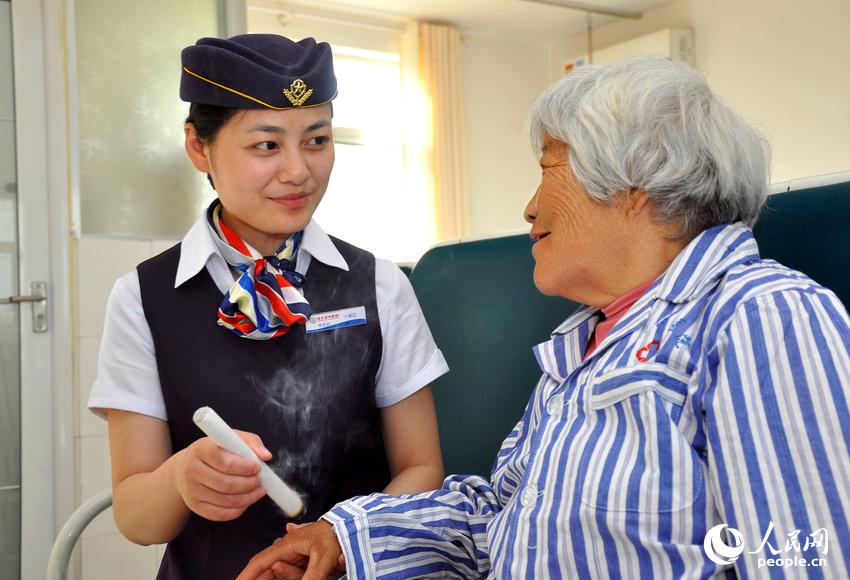 昨天上午,刚进入十病区,记者注意到,在导医台对面摆放着一茶几,两张小藤椅,茶几上摆放着白开水、饮料、水果糖、水果等食品,卜海娟告诉记者这只是患者到该病区享受空姐式服务的第一步,也是12名空姐护士在工作过程中将护理专业知识与空乘服务相结合运用的第一步,只要是到十病区的患者刚进入病区时,身着空姐服装的护士就会立刻迎上去,请其坐下,先问其想喝点或吃点什么,让患者感觉并不是来就医,而是来享受服务的,这样患者的心情也就会很愉悦,与医生沟通病情也会很和谐。图片来源:人民网