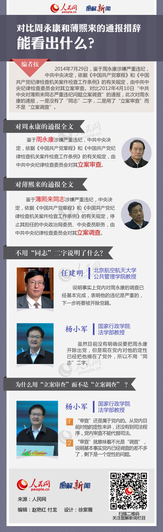 编者按:2014年7月29日,鉴于周永康涉嫌严重违纪,中共中央决定,依据《中国共产党章程》和《中国共产党纪律检查机关案件检查工作条例》的有关规定,由中共中央纪律检查委员会对其立案审查。对比2012年4月10日“中共中央对薄熙来同志严重违纪问题立案调查”的通报,此次对周永康的通报,一是没有了“同志”二字,二是用了“立案审查”而不是“立案调查”。