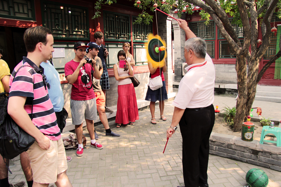 2014年8月25日,北京,来自孔子学院夏令营的国际留学生来到北京空竹博物馆参观,空竹博物馆馆长李连元为大家讲解空竹的构造、分类以及发展历史,并为大家现场表演。他娴熟的技艺得到洋学生的阵阵掌声,一些留学生还在李馆长的指导下,在不到一个小时的时间里也抖得有模有样。中国网宋一安 摄