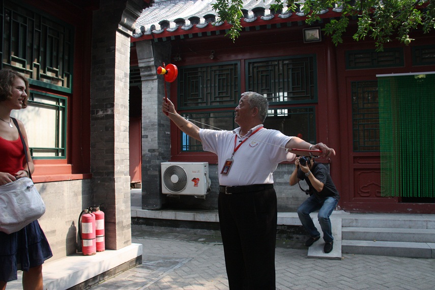 2014年8月25日,北京,来自孔子学院夏令营的国际留学生来到北京空竹博物馆参观,空竹博物馆馆长李连元为大家讲解空竹的构造、分类以及发展历史,并为大家现场表演。他娴熟的技艺得到洋学生的阵阵掌声,一些留学生还在李馆长的指导下,在不到一个小时的时间里也抖得有模有样。黄富友摄
