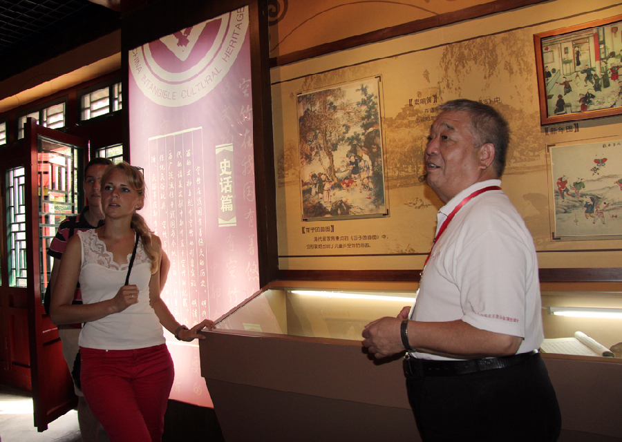 2014年8月25日,北京,来自孔子学院夏令营的国际留学生来到北京空竹博物馆参观,空竹博物馆馆长李连元为大家讲解空竹的构造、分类以及发展历史,并为大家现场表演。他娴熟的技艺得到洋学生的阵阵掌声,一些留学生还在李馆长的指导下,在不到一个小时的时间里也抖得有模有样。中国网宋一安 摄