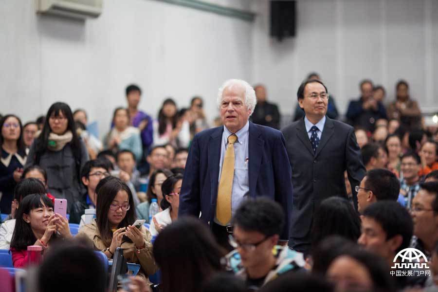 10月22日晚,中国科学院大学(简称“国科大”)举办第159场科学与人文论坛,主题是“与科学大师对话——诺奖大师的科研成就和成长经历”。 1997年诺贝尔奖生理及医学奖得主斯坦利•普鲁西纳博士(Stanley B. Prusiner)在论坛上做了幽默风趣的演讲。图为普鲁西纳博士在苏刚校长陪同下入场。耿瑜阳摄
