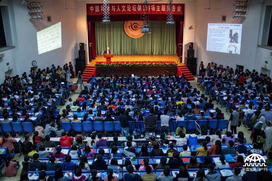 10月22日晚,中国科学院大学(简称“国科大”)举办第159场科学与人文论坛,主题是“与科学大师对话——诺奖大师的科研成就和成长经历”。 1997年诺贝尔奖生理及医学奖得主斯坦利•普鲁西纳博士(Stanley B. Prusiner)在论坛上做了幽默风趣的演讲。图为论坛现场。耿瑜阳摄