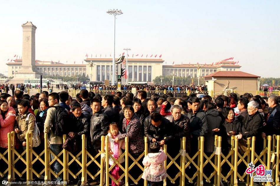 2014年11月8日上午,北京,大量游客正在排队等候进入天安门广场。