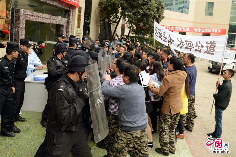 少数仇富、仇官,仇视社会的极端分子借此机会挑拨患者家属情绪,扩大事态影响,砍杀医护人员劫持人质,并将矛头指向群众乱杀无辜,“暴徒”分子随后放火燃烧大楼,事态十分严重。当地迅速调集公安、消防、武警、特警等部门近百余名精干力量赶赴现场处置,击毙一名暴徒分子营救出人质控制其同伙,并成功扑救了火灾疏散救助受伤群众,保证了当地社会形势安全稳定。