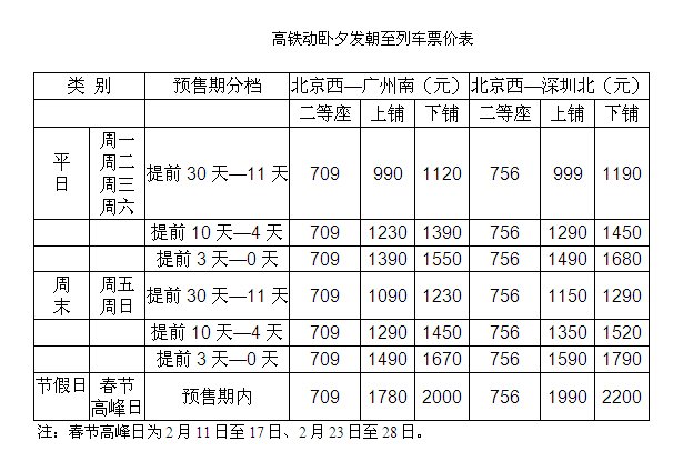 新京报快讯(记者林野)记者刚从北京铁路局获悉,为更好地满足广大旅客出行需求,从2015年1月1日起,至3月15日春运结束,铁路部门将开行北京西至深圳北D901/902、D903/904次,北京西至广州南D921/922、D923/924次共计4对高铁动卧列车。票价最低709元。