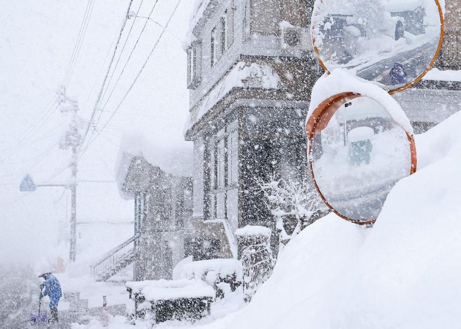 新潟县十日町市:降雪严重,积雪已达到安全凸面镜的高度。(网站截图)