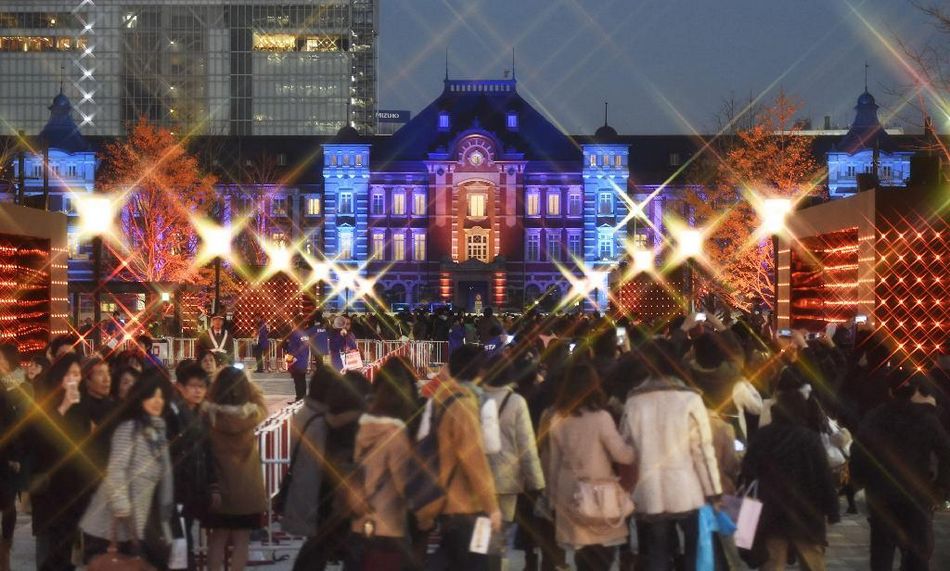 日本东京站于1914年(大正3年)正式启动运营。按照当时原貌复原的东京站,在灯光的点染下分外美丽,站前大街上聚集的人群不由得发出阵阵赞叹。